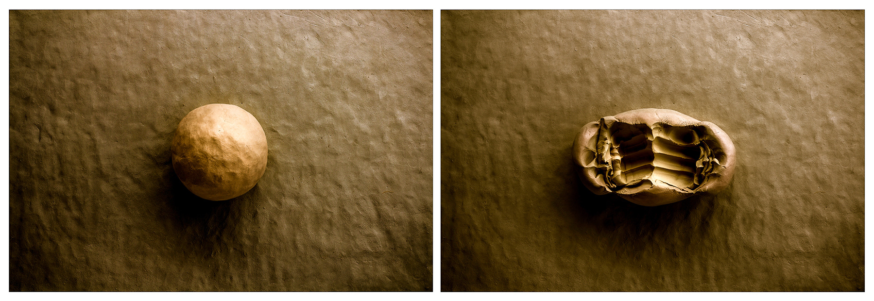 dichte kleibal open getrokken, sporenfossiel bestaande uit ogenschijnlijk 4 onderdelen, 2
