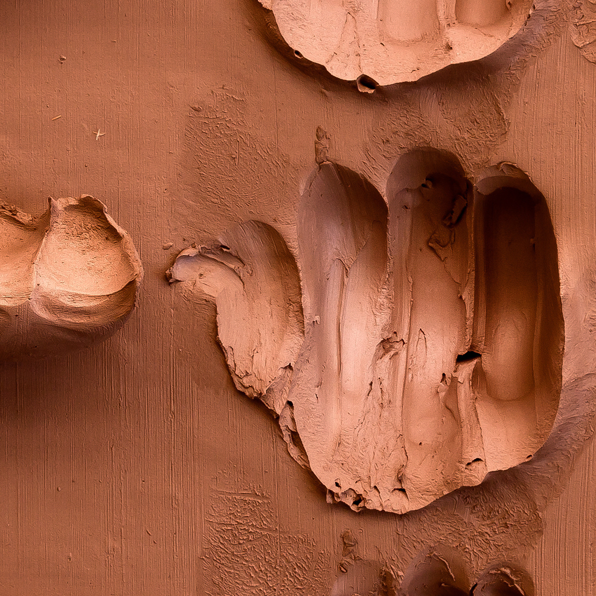 Gestructueerd is acht keer een hap uit de klei gehaald en ernaast neergelegd, met de linker en de rechter hand. De kleur terracotta suggereerd dat het kleitablet was blootgesteld aan grote hitte.