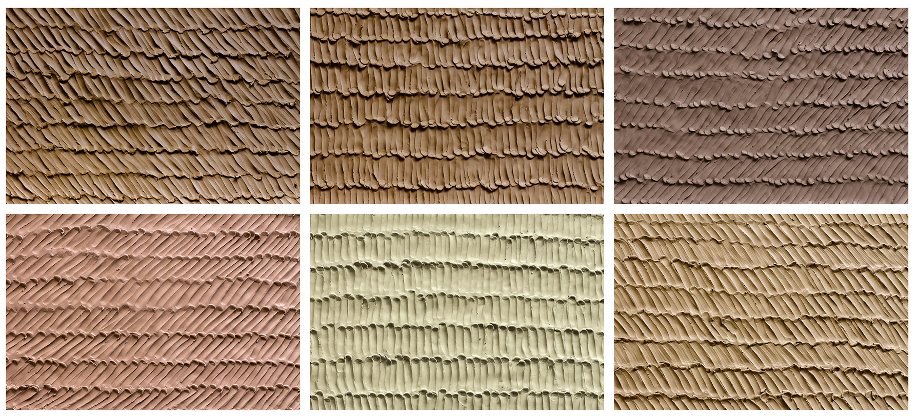 zonder titel1' bestaat uit zes verschillende panelen van sporen met de vingertoppen geschraapt in natte klei, fotografisch gesedimenteerd, digitaal bewerkt (aardkleuren die door hitte ontstaan zouden kunnen zijn).