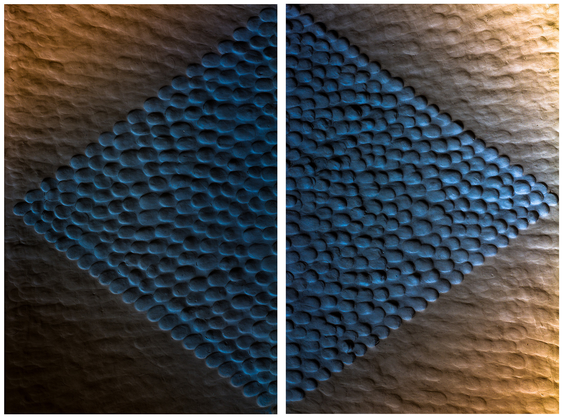 sporenfossiel, bewerkt met de vingertoppen, het linker paneel met die van de rechter hand, het rechter met die van de linker hand.