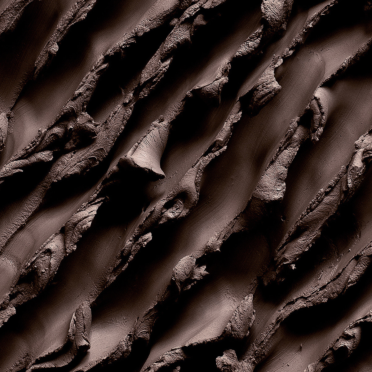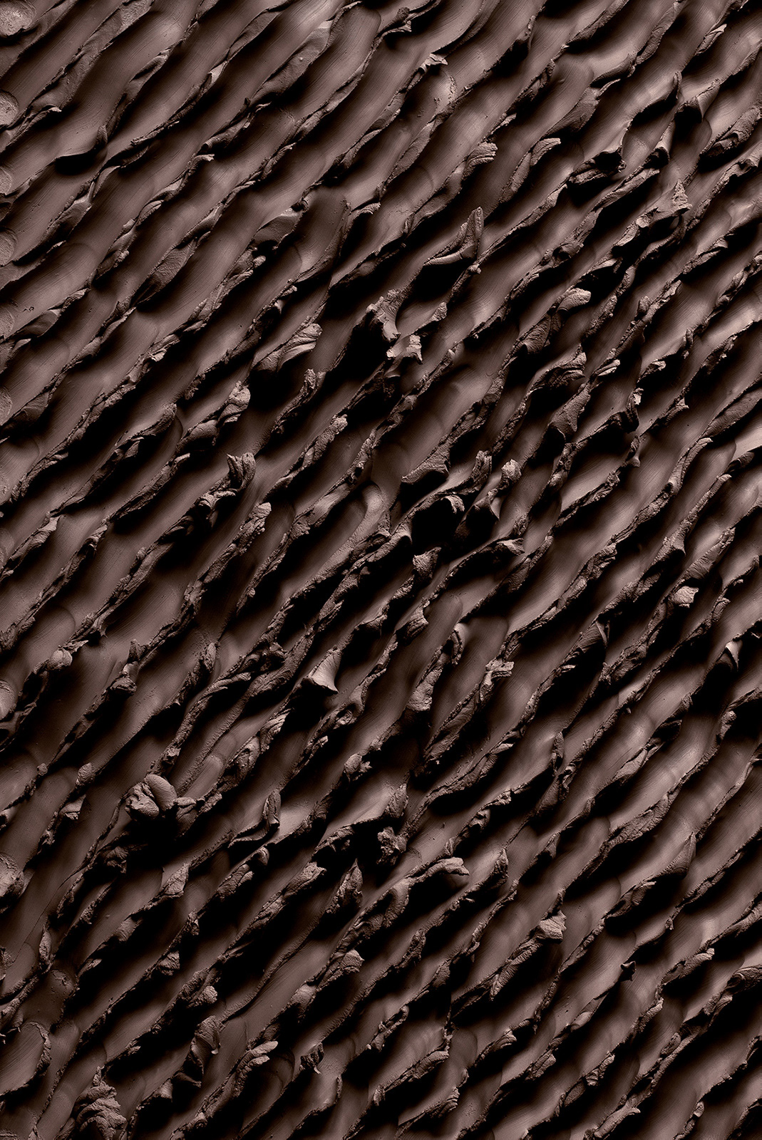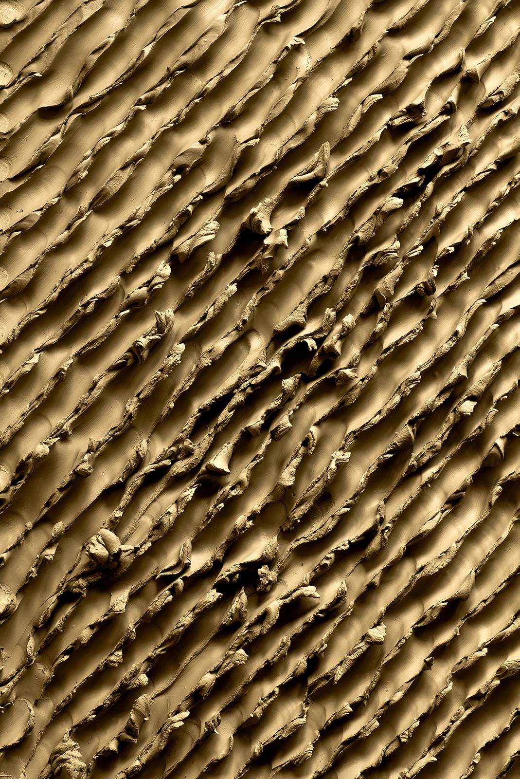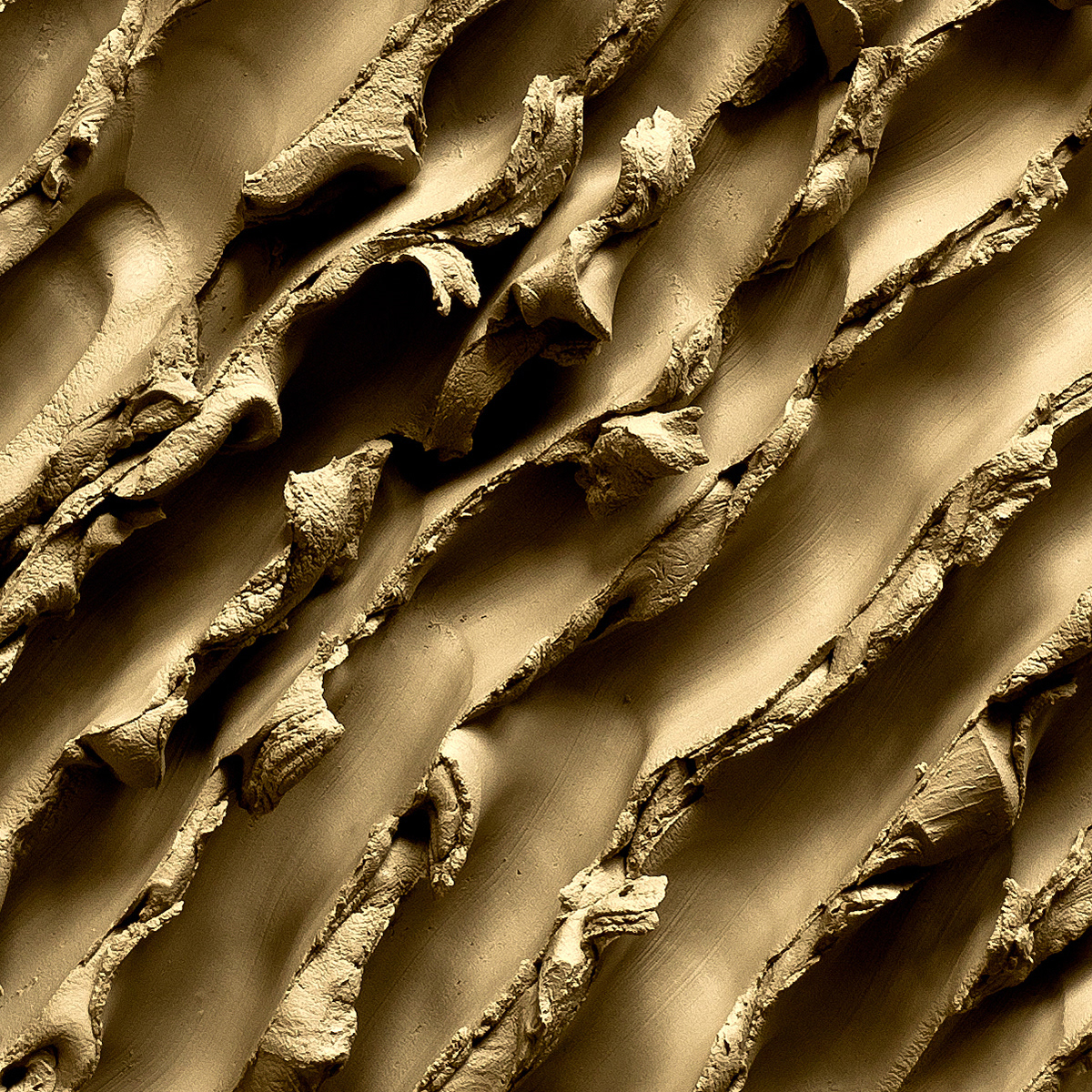 met de vingers zijn gelijkmatige voren in de klei getrokken. Softwarematige inkleuring varieert van oker tot casselse aarde.
